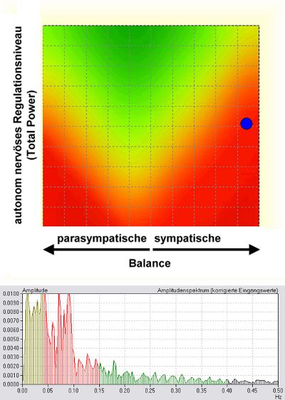 Ein typisches Beispiel für einen jüngeren gesunden Angestellten mit chronisch hoher Arbeitsbelastung und hohem Beanspruchungsgefühl findet sich in nachstehender Abbildung. Bemerkenswert ist insbesondere die extrem stark ausgeprägte sympathisch-parasympathische Balanceverschiebung zulasten einer kardio-vagalen Hypoaktivierung.